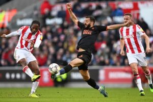 ซึ่งนาห์กี เวลส์เปลี่ยนตัวจากระยะประชิดเป็นประตูที่ 8 ของฤดูกาล แต่สโต๊คก็มาได้ประตูตีเสมอในช่วงทดเวลาบาดเจ็บครึ่งแรกเมื่อ เลียม เดลาป ได้โอกาสยิงจากจังหวะที่ เลียม เดลาป จ่ายบอลทะลุช่องให้ แอนดี้ คิง เซ็นเตอร์แบ็คยิงผ่านแม็กซ์ โอเลียรี่ จากระยะ 10หลาเข้าไปอย่างเฉียบขาด พอตเตอร์สเดินหน้า 12 นาทีหลังจากบุกผ่านไดรฟ์ต่ําของบราวน์จากมุมในกรอบ